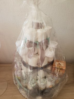 Feestelijk verpakte luiertaart.