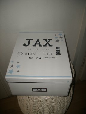 Kartonnen opbergdoos met naam en sierlijke randen.