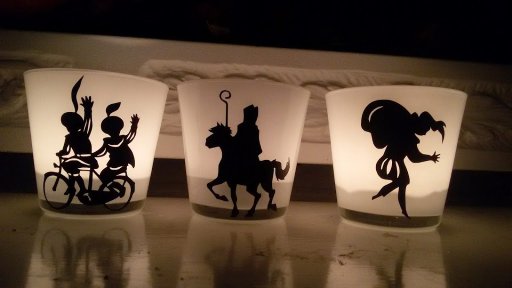 Glazen theelicht met Sint en/of Piet afbeelding.