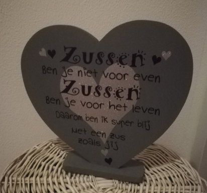 Houten hart op voet met "zussen"tekst op glitterhart.