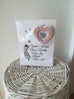Houten tekstbord op voet met fotolijstje hart.